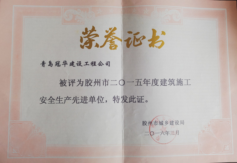 膠州市2015年度建筑施工安全生產(chǎn)先進(jìn)單位